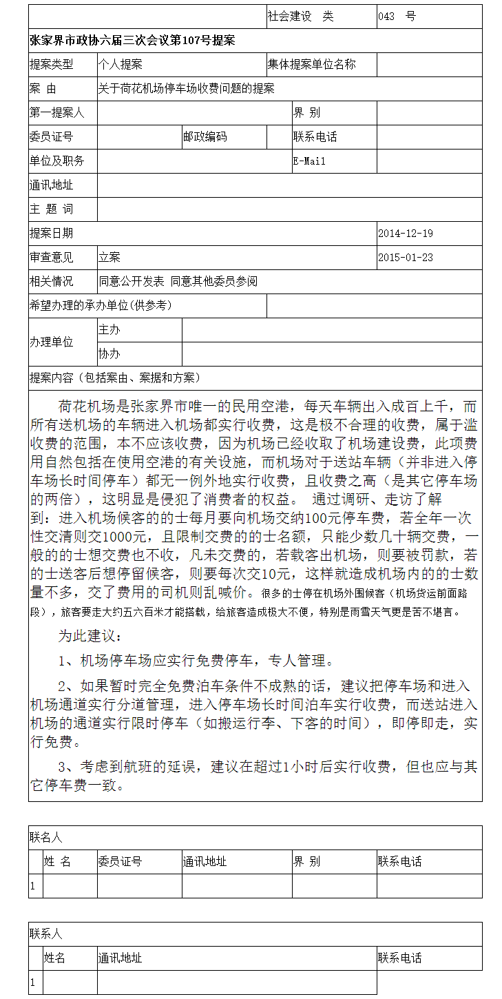 市政协六届三次会议第107号提案 ——荷花机场停车场收费问题